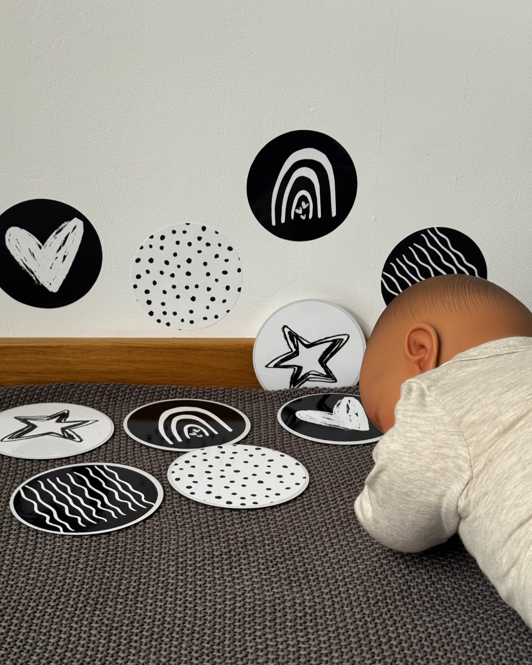 Klebe die Karten in den ersten Wochen in einem Abstand von etwa 20–30 cm hin (so weit sieht dein Baby am besten)